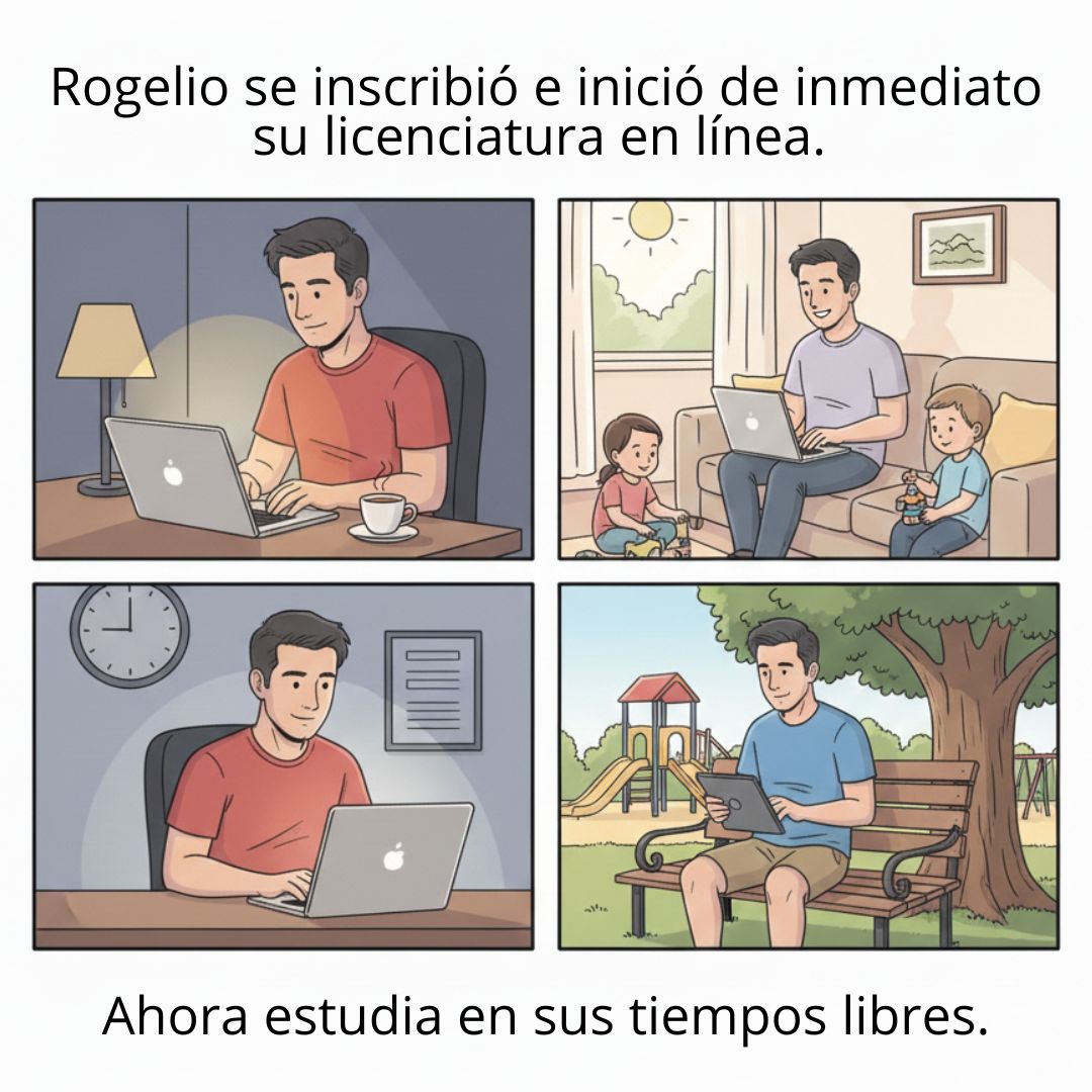 Rogelio comprendió que estudiar en línea no significa sacrificar, sino equilibrar. La clave está en la flexibilidad y la autonomía.