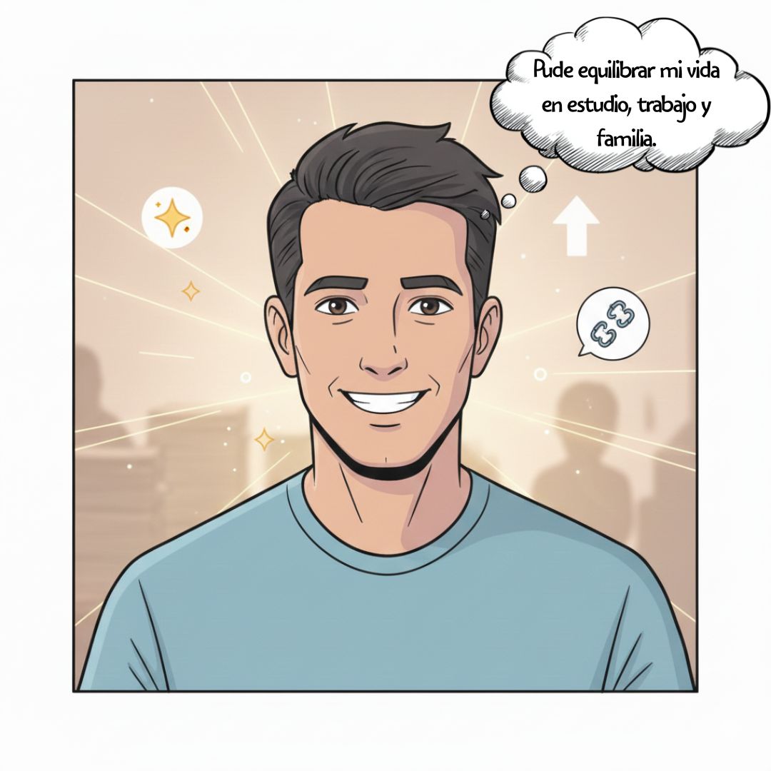 El miedo de quedarse rezagado desapareció cuando se dio cuenta de que sus estudios empezaban a reflejarse en su trabajo. Aplicaba lo aprendido en tiempo real y comenzó a destacar como alguien con iniciativa y conocimientos frescos. Su jefe notó el cambio.